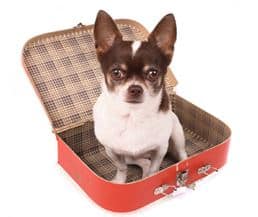 different policies regarding travel with pets. Nearly all charge a fee. Before paying for a reservation, call the airline to determine its pet policy. Remember, airline policies are subject to change without notice. Because of the Chihuahua’s small size, he may avoid being checked as baggage. The dog must, however, be in a proper-sized carrier with room to move around. The carrier has to fit underneath your seat.